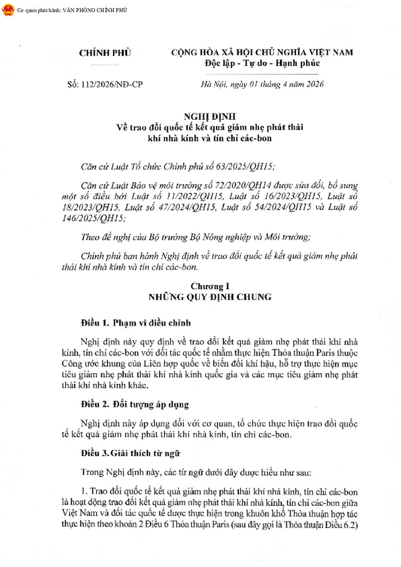 | Tiêu đề văn bản | Nghị định về trao đổi quốc tế kết quả giảm nhẹ phát thảo khí nhà kính và tín chỉ các bon | ||