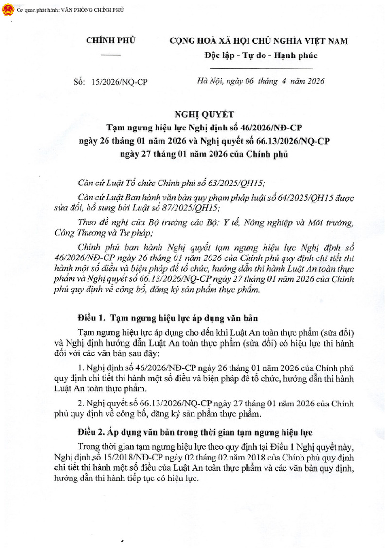 | Tiêu đề văn bản | Nghị quyết Tạm ngưng hiệu lực Nghị định số 46/2026/NĐ-CP ngày 26 tháng 01 năm 2026 và Nghị quyết số 66.13/2026/NQ-CP ngày 27 tháng 01 năm 2026 của Chính phủ | ||