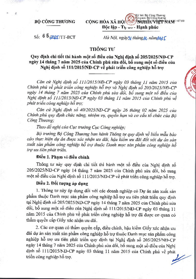 | Tiêu đề văn bản | Thông tư quy định chi tiết thi hành một số điều của Nghị định số 205/2025/NĐ-CP ngày 14 tháng 7 năm 2025 của Chính phủ sửa đổi, bổ sung một số điều của Nghị định số 111/2015/NĐ-CP về phát triển công nghiệp hỗ trợ | ||