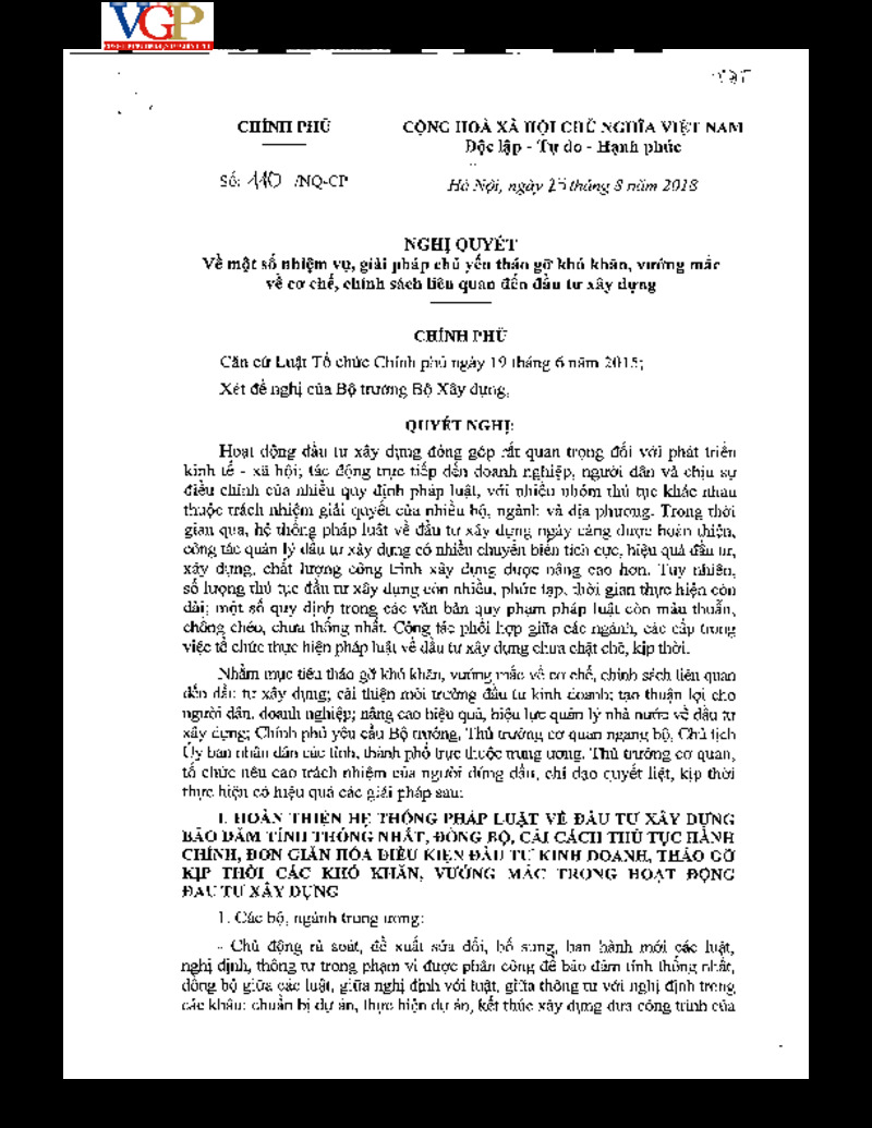 | Tiêu đề văn bản | Nghị Quyết Về một số nhiệm vụ, giải pháp chủ yếu tháo gỡ khó khăn, vướng mắc về cơ chế, chính sách liên quan đến đầu tư xây dựng | ||