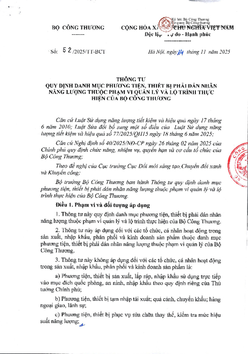 | Tiêu đề văn bản | Thông tư quy định danh mục phương tiện, thiết bị phải dán nhãn năng lượng thuộc phạm vi quản lý và lộ trình thực hiện của Bộ Công Thương | ||