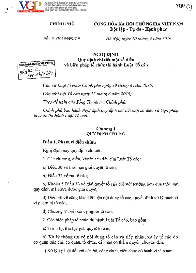| Số hiệu | Số: 31/2019/NĐ-CP | Cơ quan ban hành | 64dad9609d7c883f720a7d82 |