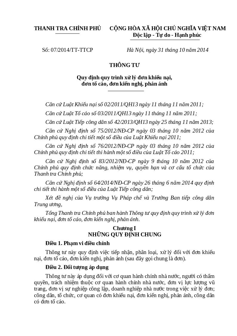 | Số hiệu | 07/2014/TT-TTCP | Cơ quan ban hành | 64e216f552426ae4840ce312 |