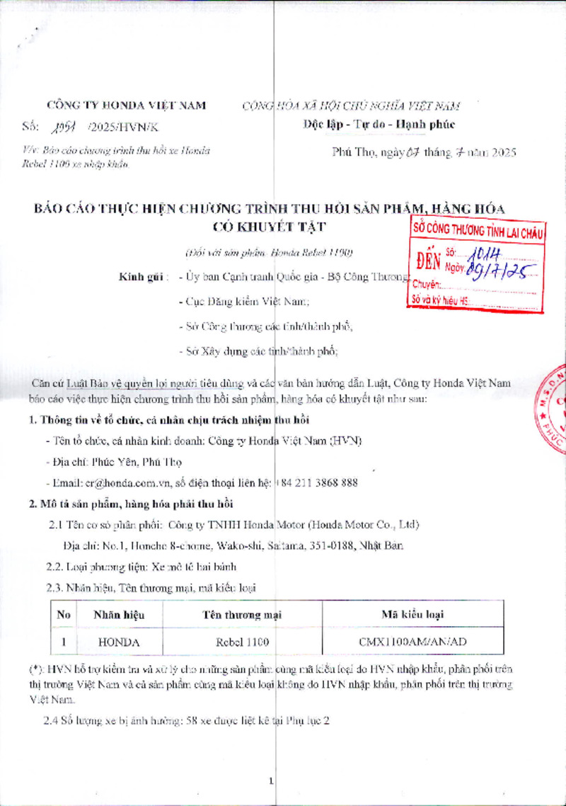 Ngày 07 tháng 7 năm 2025, Công ty Honda Việt Nam ban hành Báo cáo thực hiện chương trình thu hồi sản phẩm, hàng hóa có khuyết tật (Đối với sản phẩm: Honda Rebel 1100)