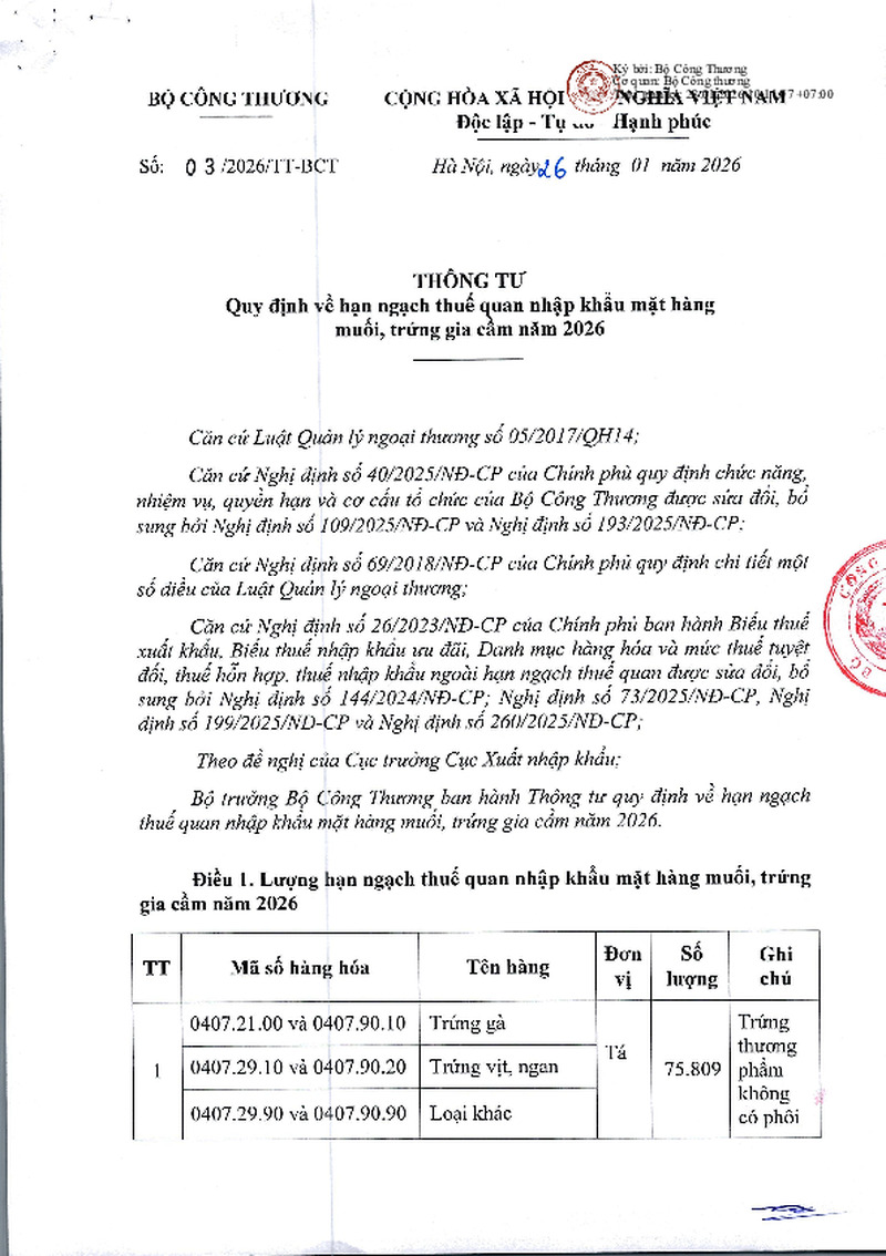 | Tiêu đề văn bản | Thông tư quy định về hạn ngạch thuế quan nhập khẩu mặt hàng muối, trứng gia cầm năm 2026 | ||