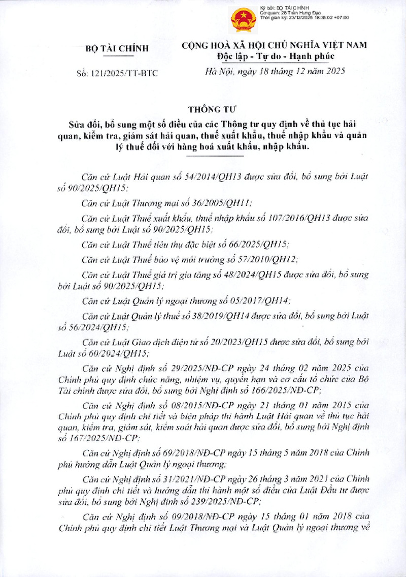 | Số hiệu | 121/2025/TT-BTC | Cơ quan ban hành | 64e2dd30dba196c397084eb2 |