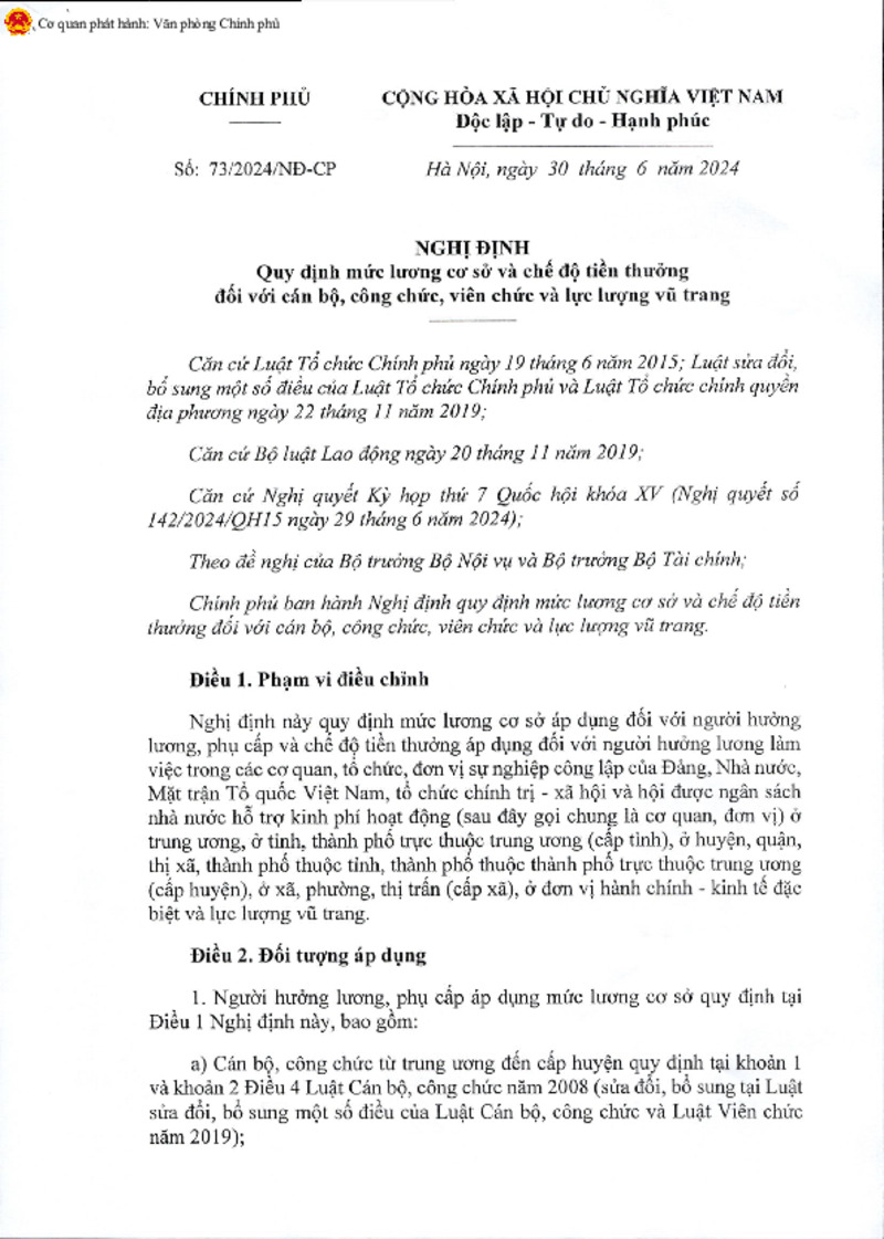 | Tiêu đề văn bản | Nghị định quy định mức lương cơ sở và chế độ tiền lương đối với cán bộ, công chức, viên chức và lực lượng vũ trang | ||