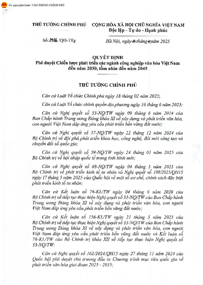 | Tiêu đề văn bản | Quyết định Phê duyệt Chiến lược phát triển các ngành công nghiệp văn hóa Việt Nam đến năm 2030, tầm nhìn đến năm 2045 | ||