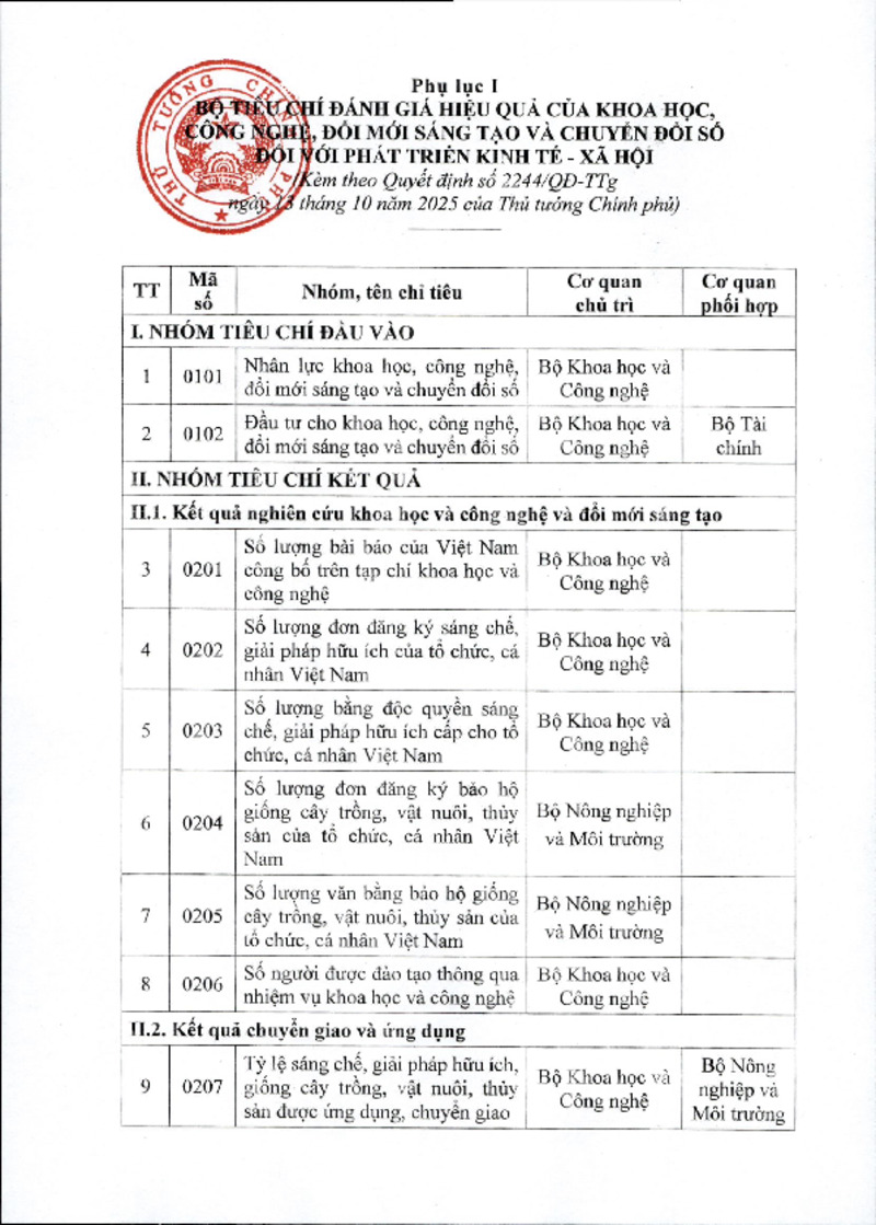 | Tiêu đề văn bản | Quyết định số 2244/QĐ-TTg ngày 13/10/2025 của Thủ tướng Chính về việc ban hành Bộ tiêu chí đánh giá hiệu quả của khoa học, công nghệ, đổi mới sáng tạo và chuyển đổi số đối với phát triển kinh tế - xã hội. | ||