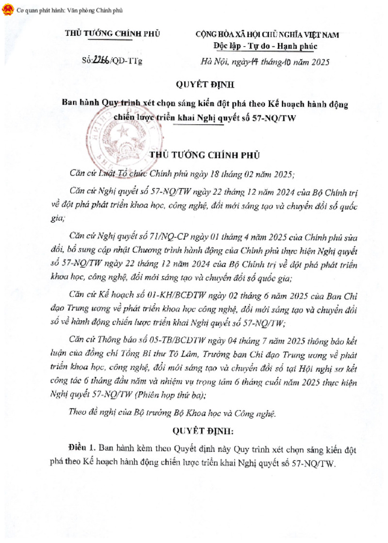 | Tiêu đề văn bản | Quyết định số 2266/QĐ-TTg ngày 14/10/2025 của Thủ tướng Chính phủ Quy trình xét chọn sáng kiến đột phá theo Kế hoạch hành động chiến lược triển khai Nghị quyết số 57-NQ/TW | ||