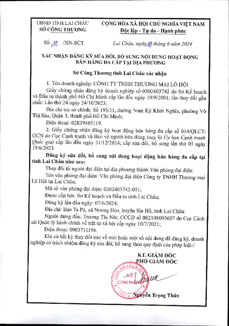 | Tiêu đề văn bản | Xác nhận đăng ký sửa đổi, bổ sung nội dung hoạt động bán hàng đa cấp tại địa phương (Công ty TNHH Thương mại Lô Hội) | ||