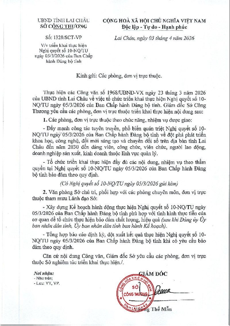 | Tiêu đề văn bản | Triển khai thực hiện Nghị quyết số 10-NQ/TU ngày 05/3/2026 của Ban Chấp hành Đảng bộ tỉnh | ||