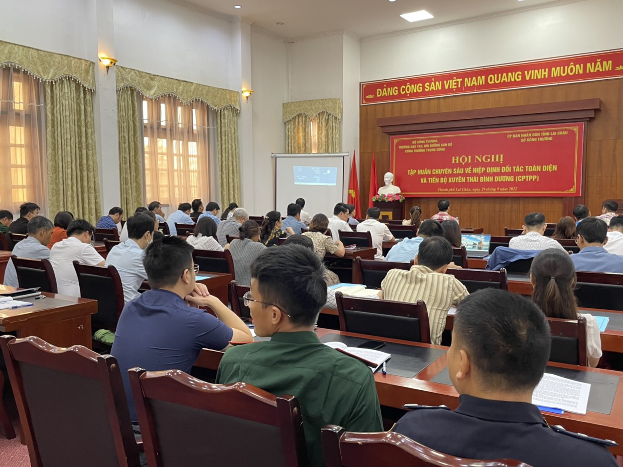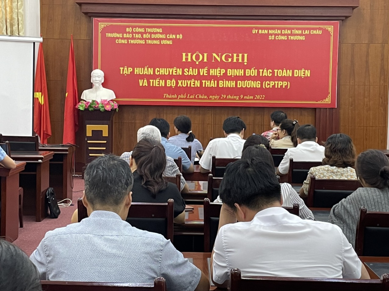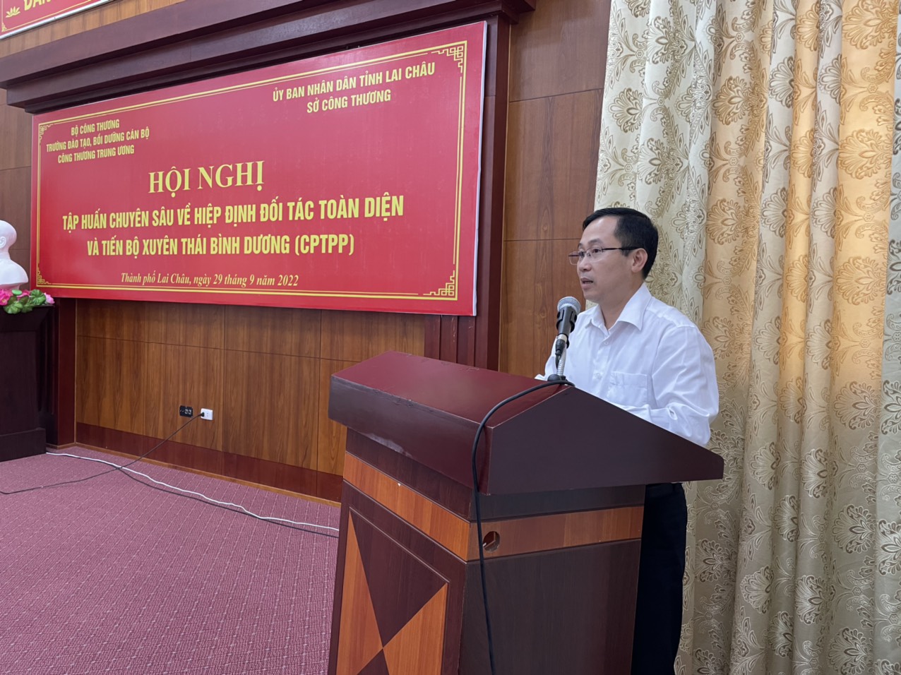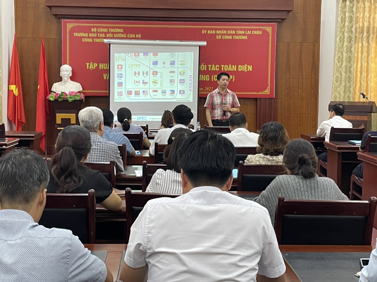 Thực hiện Kế hoạch số 249/KH-UBND ngày 28/02/2019 của UBND tỉnh Lai Châu về thực hiện Hiệp định Đối tác toàn diện và Tiến bộ xuyên Thái Bình Dương, ngày 29/9/2022, Sở Công Thương phối hợp với Trường Đào tạo, bồi dưỡng Cán bộ Công Thương Trung ương tổ chức Hội nghị tập huấn chuyên sâu về Hiệp định Đối tác toàn diện và Tiến bộ xuyên Thái Bình Dương (CPTPP).