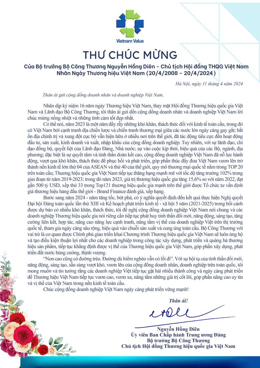 Ngày 11/04/2024, Bộ trưởng Bộ Công Thương nguyễn Hồng Diên - Chủ tịch Hội đồng THQG Việt Nam gửi Thư chúc mừng nhân ngày Thương hiệu Việt Nam