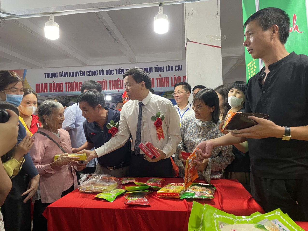 Đồng chí Lê Văn Lương - Phó Bí thư Tỉnh ủy, Chủ tịch UBND tỉnh Lai Châu mua các sản vật tại Hội chợ và tặng cho người dân