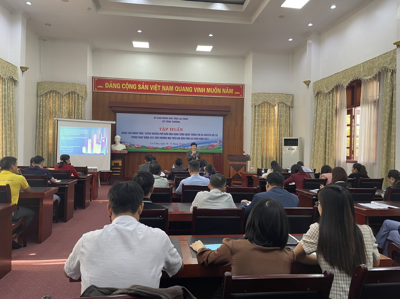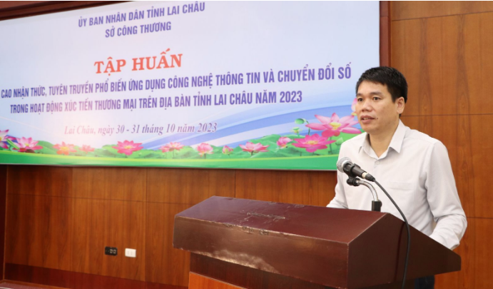 Thực hiện Kế hoạch số 911/KH-UBND ngày 17/3/2023 của UBND tỉnh về phát triển thương mại điện tử tỉnh Lai Châu năm 2023. Sáng ngày 30/10/2023, Sở Công Thương phối hợp với Viện Phát triển bền vững và Kinh tế số, Bưu Điện tỉnh, Công ty Cổ phần Truyền thông và Thương mại Dịch vụ Tây Bắc TV tổ chức lớp tập huấn nâng cao nhận thức, tuyên truyền phổ biến ứng dụng công nghệ thông tin và chuyển đổi số trong xúc tiến thương mại năm 2023. Đồng chí Nguyễn Trọng Thức - Phó Giám đốc Sở Công Thương dự và phát biểu khai mạc lớp tập huấn.